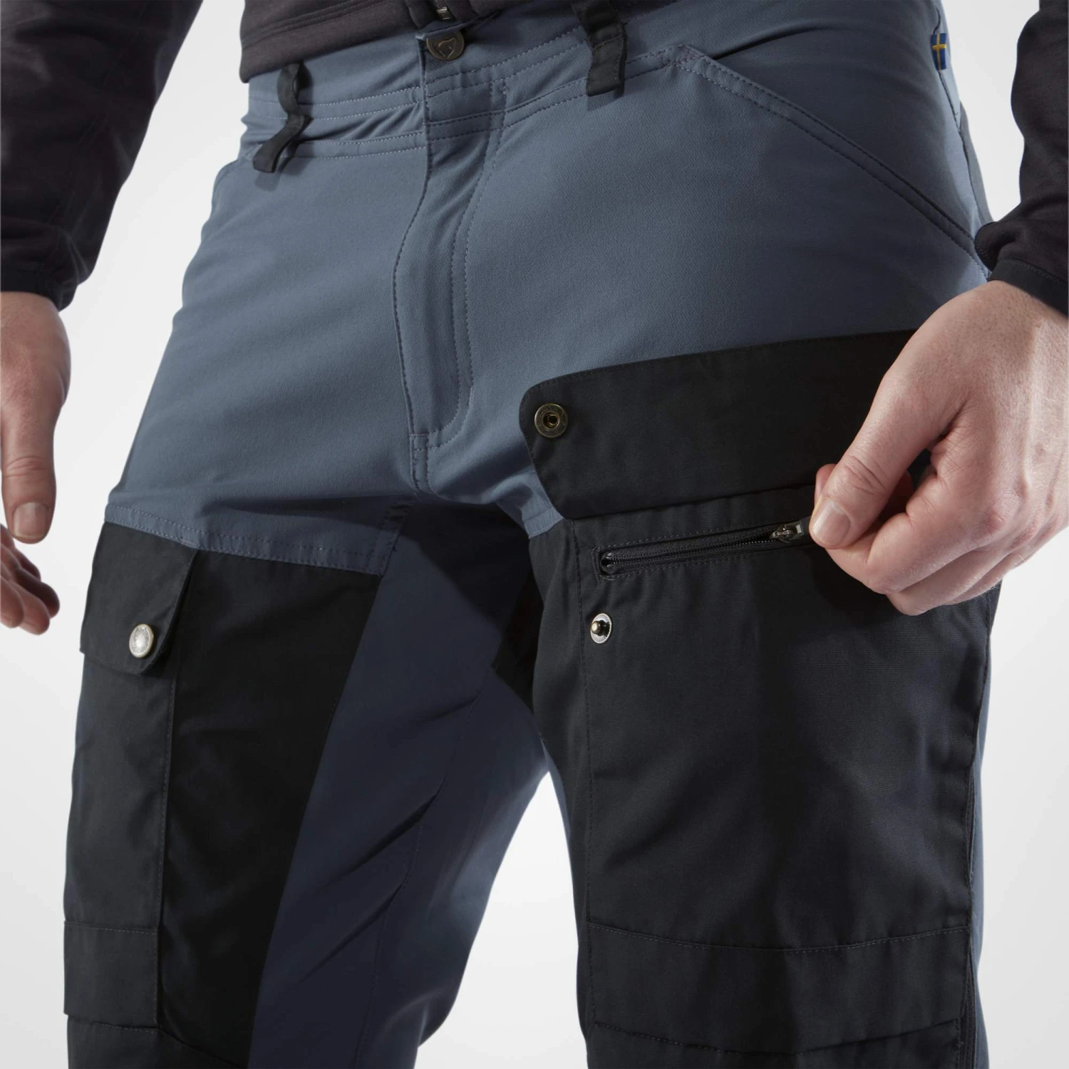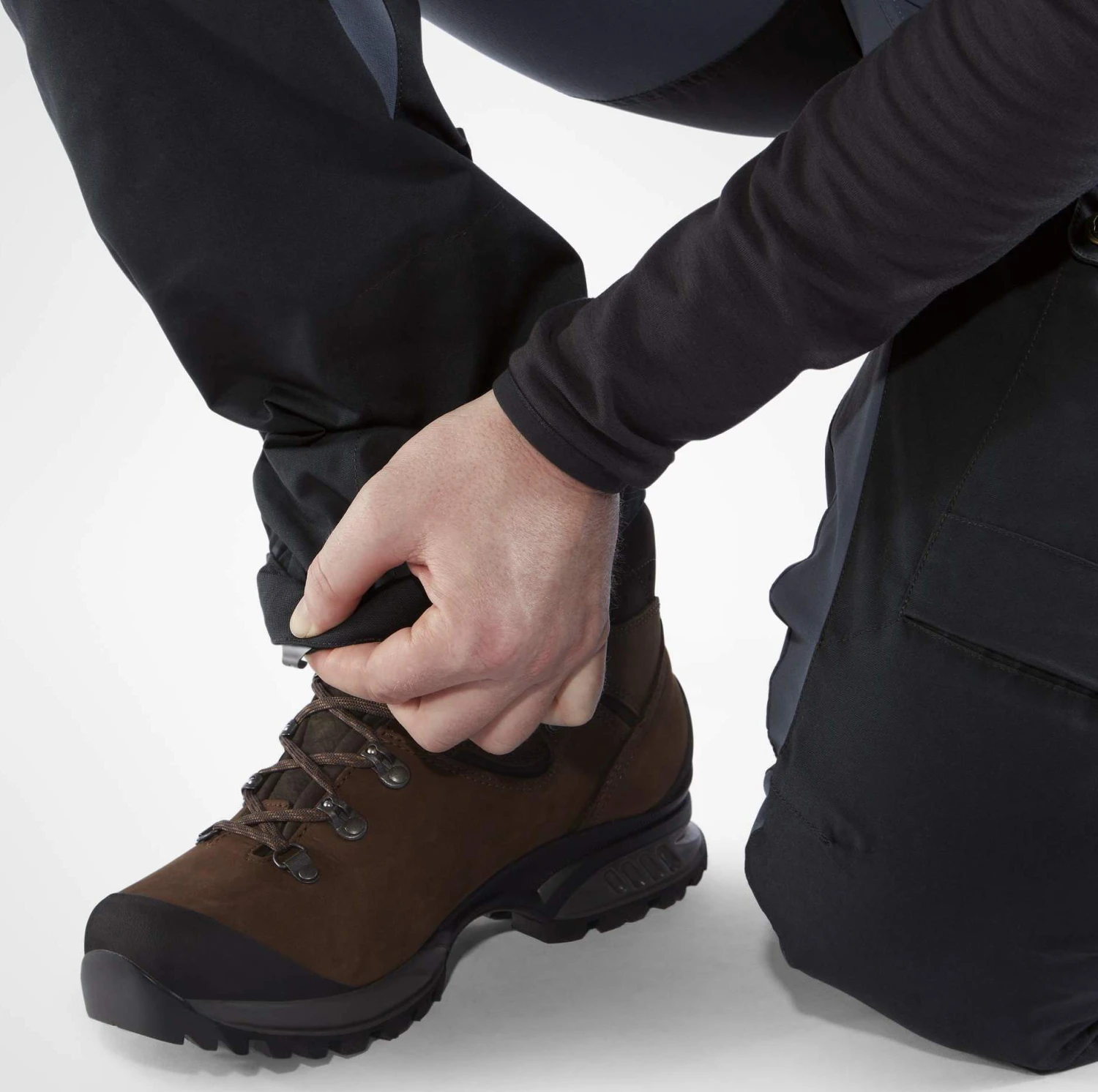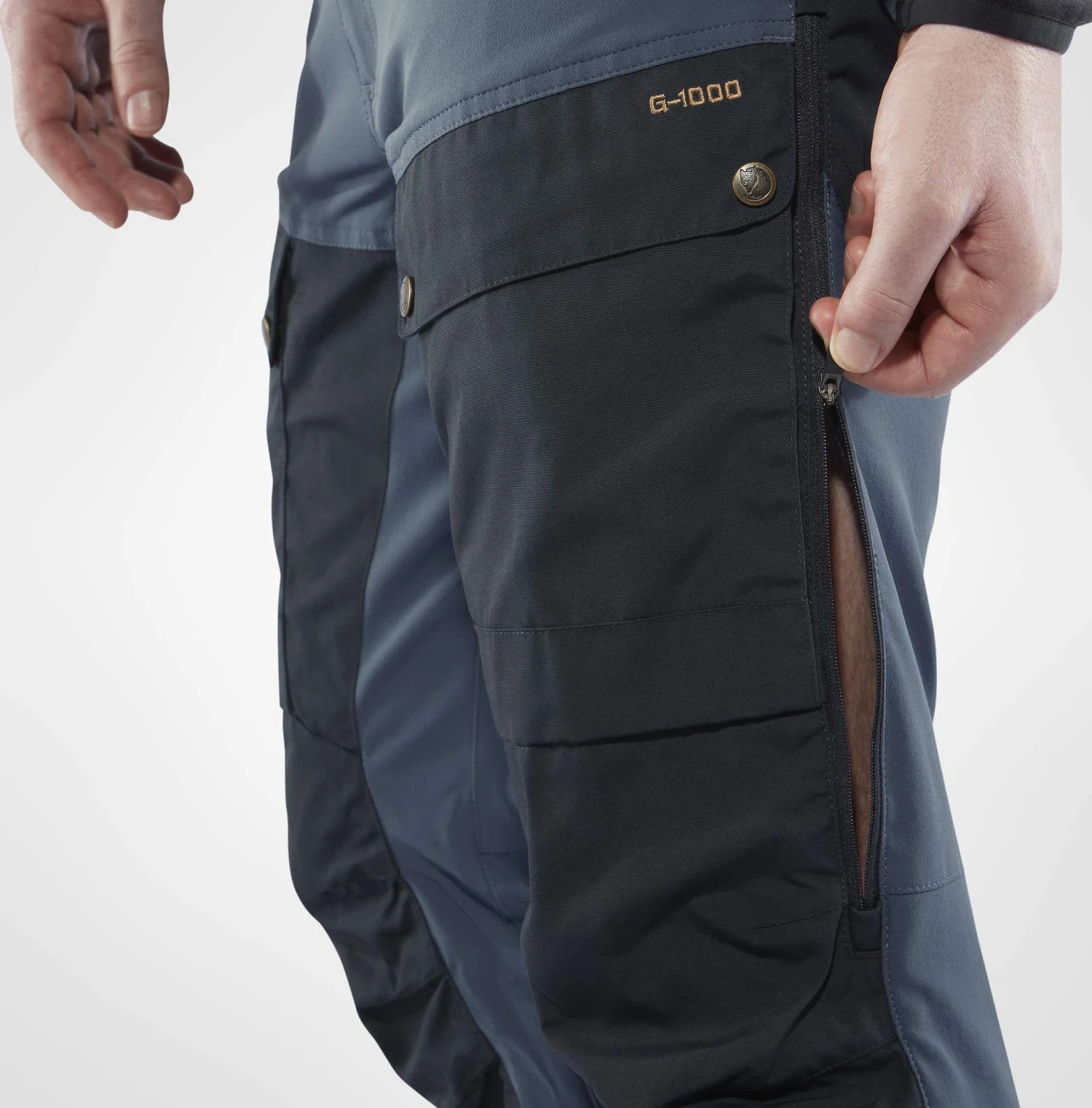 Fjällräven designed the Keb Trouser with an inner thigh seam that has been replaced by a fabric panel to reduce chafing. The pant also comes with a zippered ventilation opening from the knee-to-hip and another zipper along the calf to release leg heat. There are two leg pockets with cover flaps, one with a zip and the other with a mesh pocket inside for bits and bobs. High hand pockets hold their contents even when sitting down. Strap adjustment with button fastening and a separate hook help secure boots.