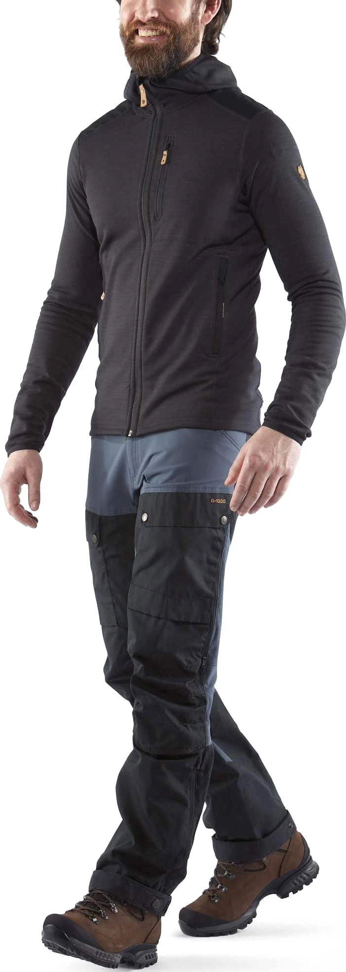 Ce pantalon comprend également du G-1000® Eco résistant à l’arrière, à l’avant des jambes, sur les genoux et en bas à l’intérieur des jambes, où une seconde couche de tissu est ajoutée comme renforcement contre l’usure due aux chaussures de randonnée. Un morceau de tissu supplémentaire à l’entrejambes et la position des coutures intérieures réduisent les risques de frottement. Une ouverture de ventilation à fermeture éclair, allant du genou à la hanche ainsi que le long du mollet, évacue les excès de chaleur. La braguette est également extensible afin de permettre une ventilation supplémentaire. Deux poches sur les jambes, une à fermeture éclair et l’autre avec un rabat, ainsi qu’une poche filet intérieure pour les petits objets. Les poches surélevées pour les mains maintiennent leur contenu en place, même lorsque l’on s’assoit. Ajustement par sangle avec boucle en bas des jambes et crochet pour fixer les chaussures de ski ou de randonnée.