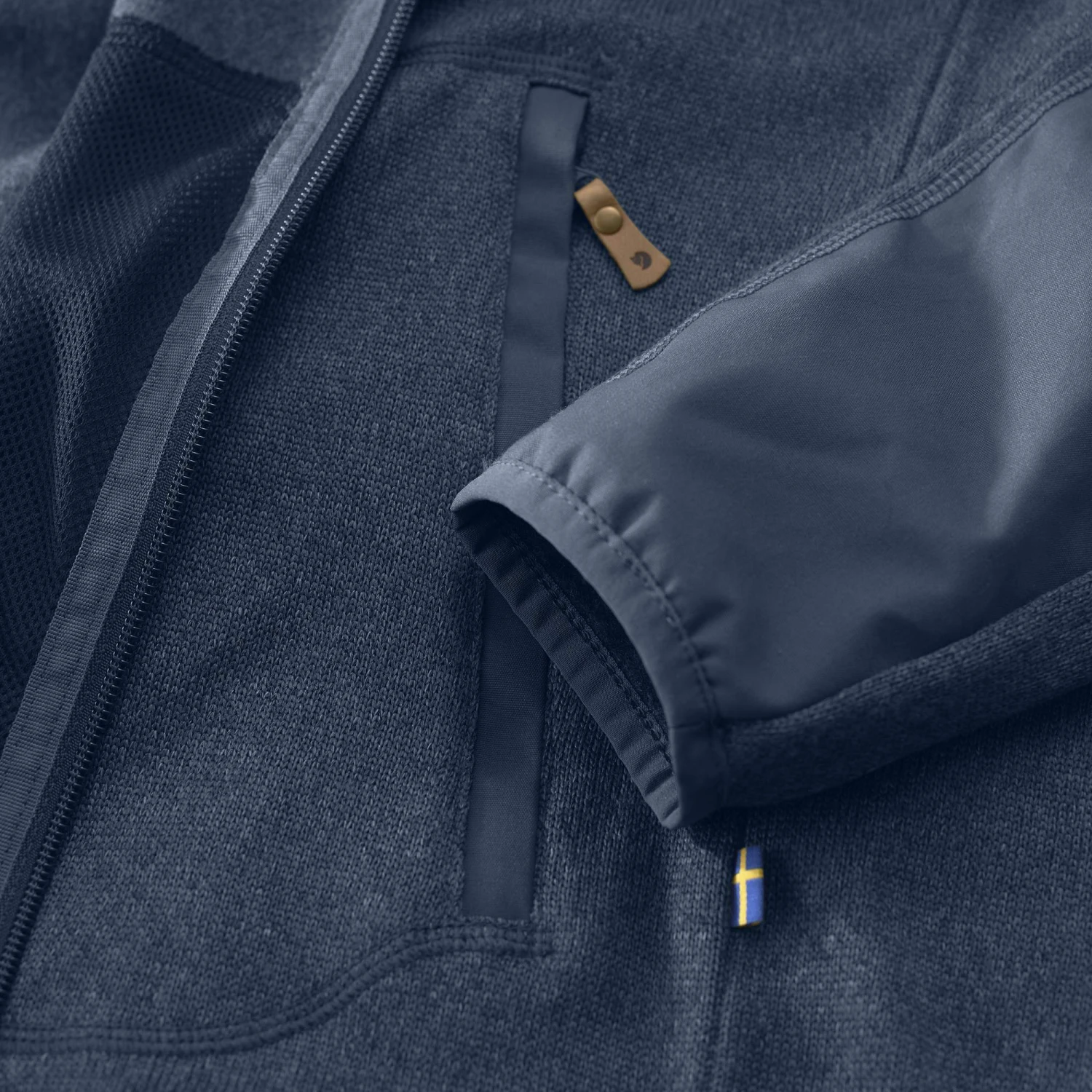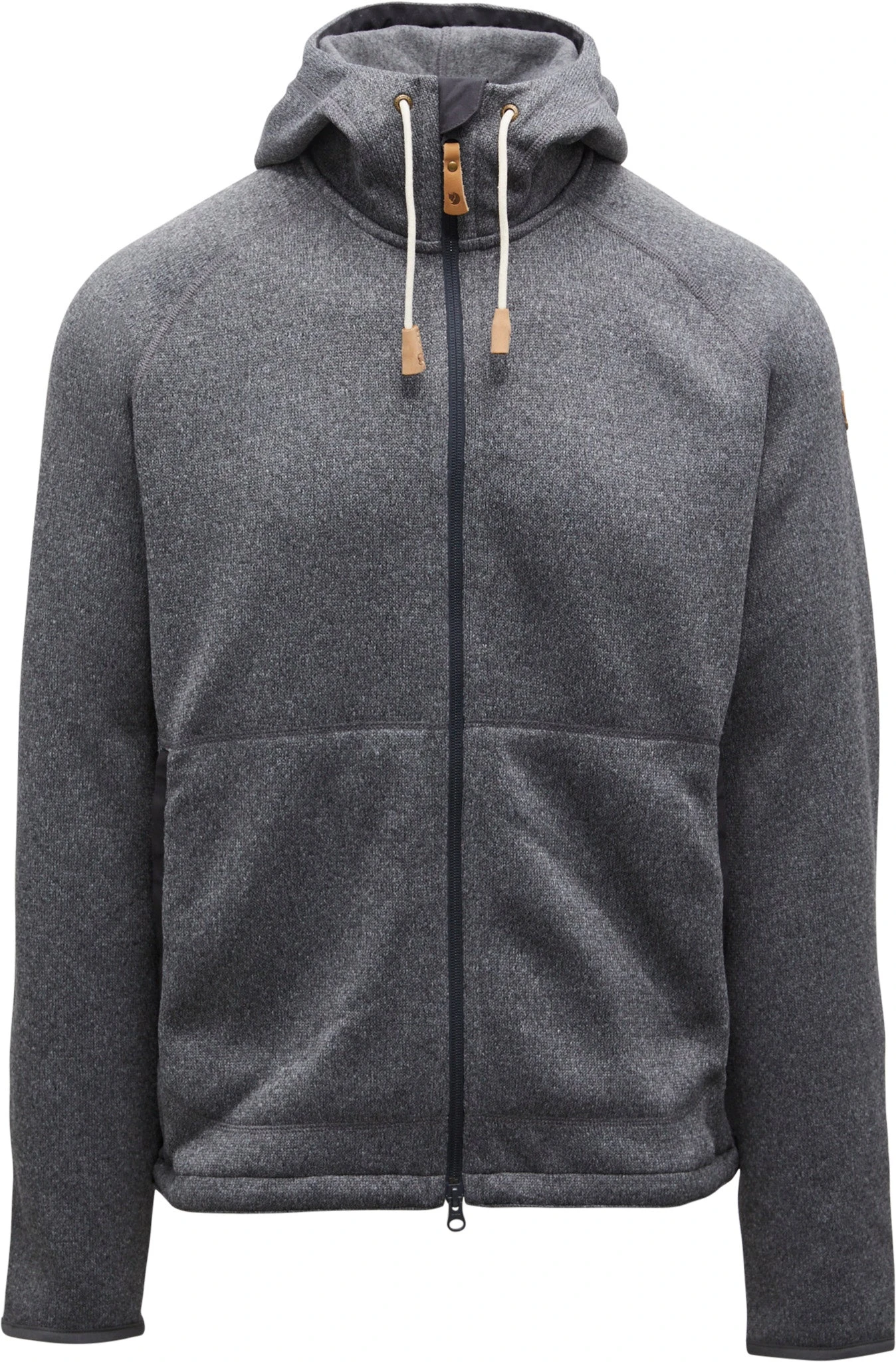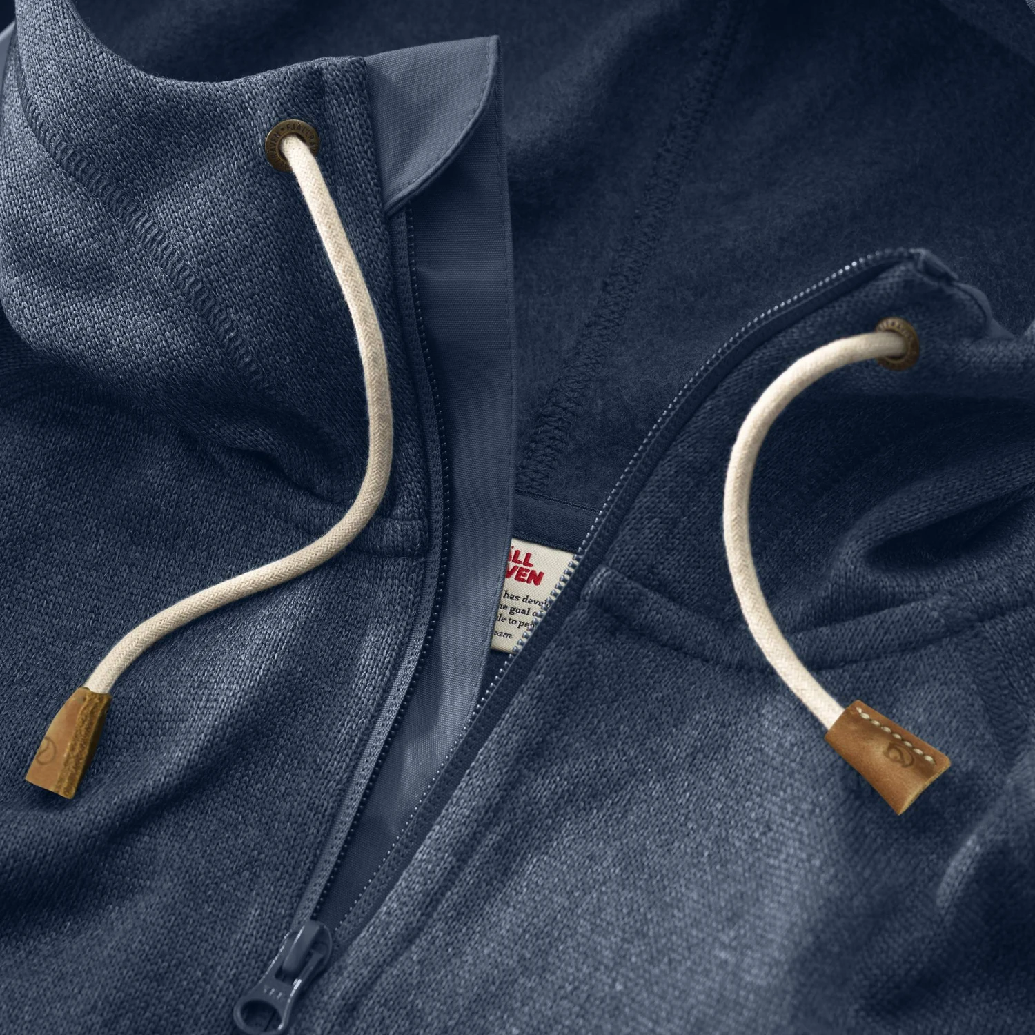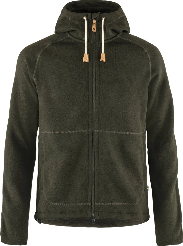 The ÖVIK Fleece Hoodie is an insulating fleece jacket with a durable knitted exterior and a super-soft brushed interior. It works as a warm mid-layer under a shell jacket and as a comfortable standalone for brisk trail adventures. Recycled polyester fleece construction has a protective chin flap along the zipper made from G-1000 Original. G-1000 also protects the elbows, hem, pockets, and the inner edge of the hood. The fixed hood and lower hem are drawcord-adjustable. Fleece and mesh pocket linings are made of recycled polyester.