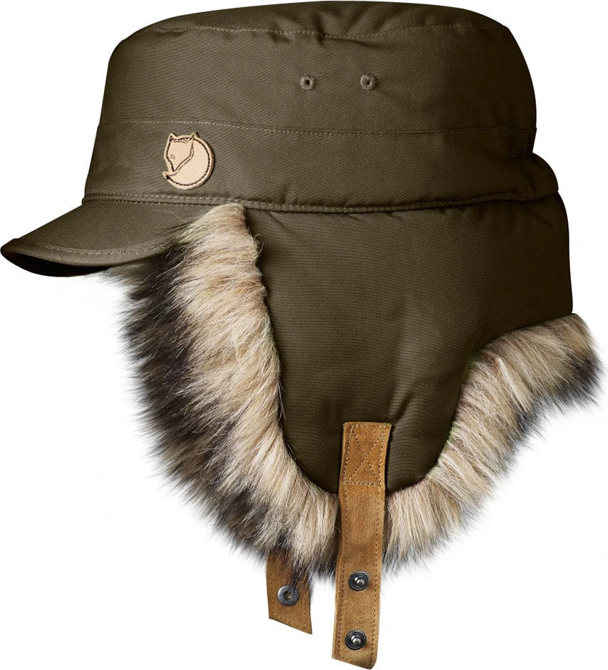 Warm winter hat in G-1000 with synthetic padding and soft, short synthetic fur on the ear flaps. Perfect for cold and windy days with a stiff brim that provides protection from the sun. Ear flaps that can be folded up and fastened with leather straps, or kept down when the wind is cold. The straps can be buttoned under the chin to hold the cap in place.